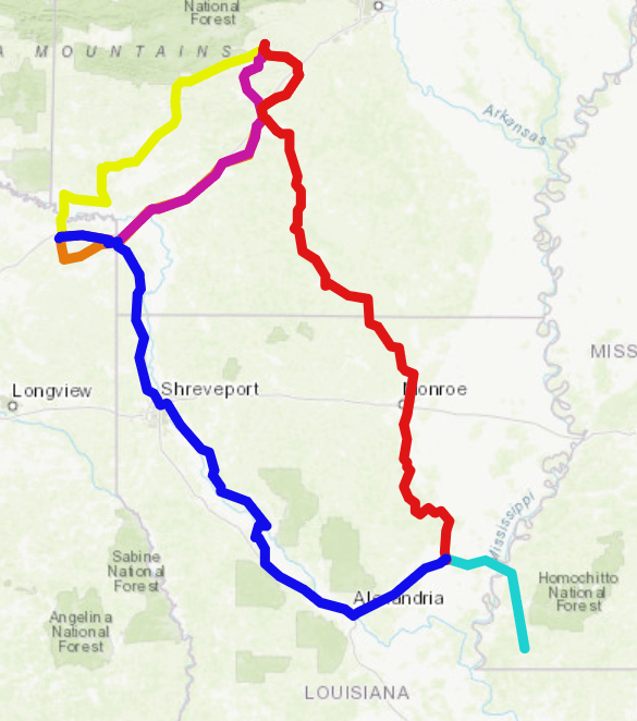 Teal: Shared Route (Woodville/Fort Adams, MS → Jonesville, LA)